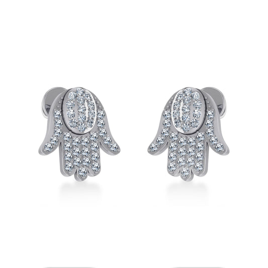 10K White Gold Round Baguette Diamond Hamza Hand Religious Stud Earring 1/5 Ctw