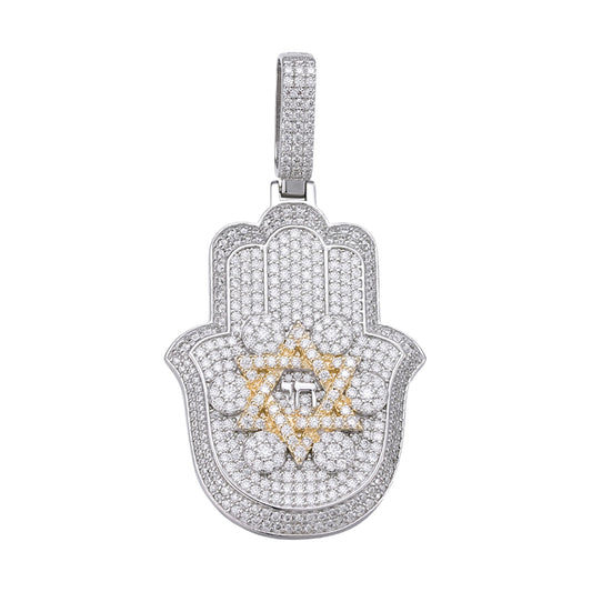 Sterling Silver Round Moissanite Hamza Hand Religious Pendant 4-5/8 Ctw