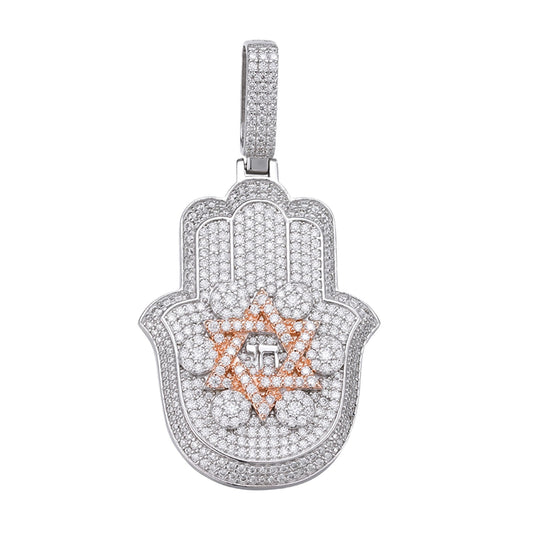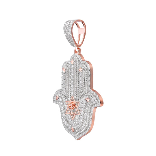 Sterling Silver Round Moissanite Hamza Hand Religious Pendant 3-5/8 Ctw