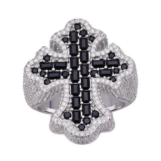 Sterling Silver Round Moissanite With Black CZ Men Cross Religious Size 10 Ring 2-5/8 Ctw