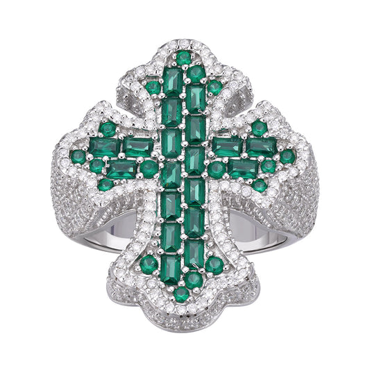 Sterling Silver Round Moissanite With Emerald CZ Men Cross Religious Size 10 Ring 2-5/8 Ctw