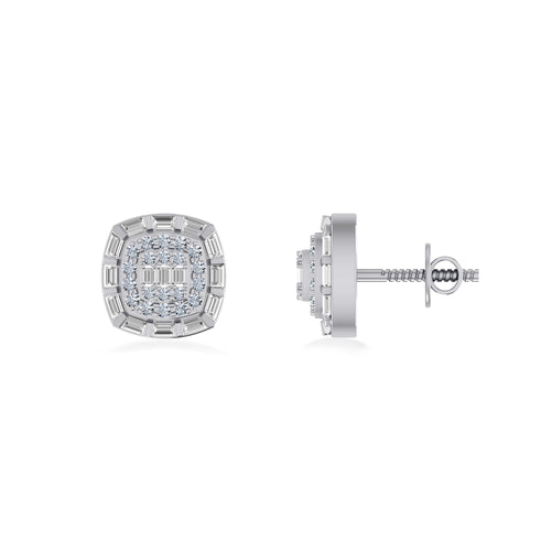 Add a touch of modern elegance with these square designer earrings, crafted in polished 10K white gold. Each earring features a radiant round diamond at the center, encircled by baguette-cut diamonds, totaling 1/2 carat. The square design offers a contemporary yet timeless look, with the shimmering diamonds catching the light from every angle. The contrast of round and baguette diamonds adds depth and sparkle, making these earrings a refined choice for any occasion.
