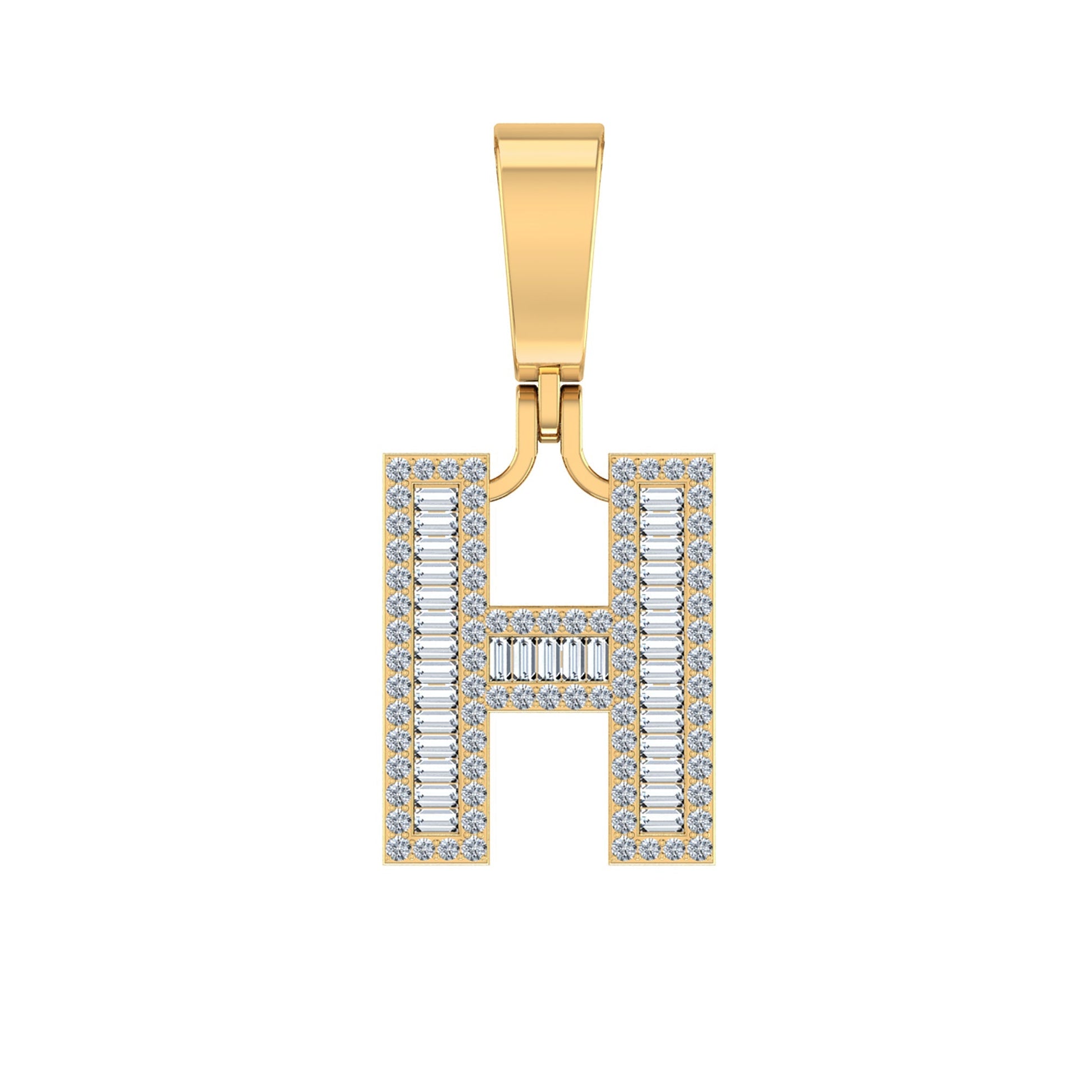 This stunning pendant features the letter "H" in radiant 10K yellow gold, beautifully adorned with baguette diamonds that total 1/2 carat. With its sleek design and elegant sparkle, this pendant is the perfect piece to personalize your jewelry collection or to give as a meaningful gift. A true symbol of luxury and individuality, it adds a refined touch to any outfit, from everyday wear to special occasions.