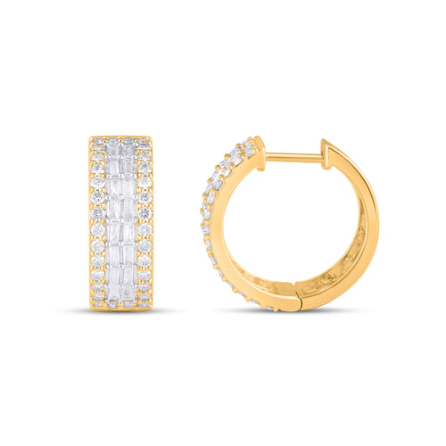 10K Yellow Gold Round Baguette Diamond 3 Row Designer Hoop Earring 1 Ctw