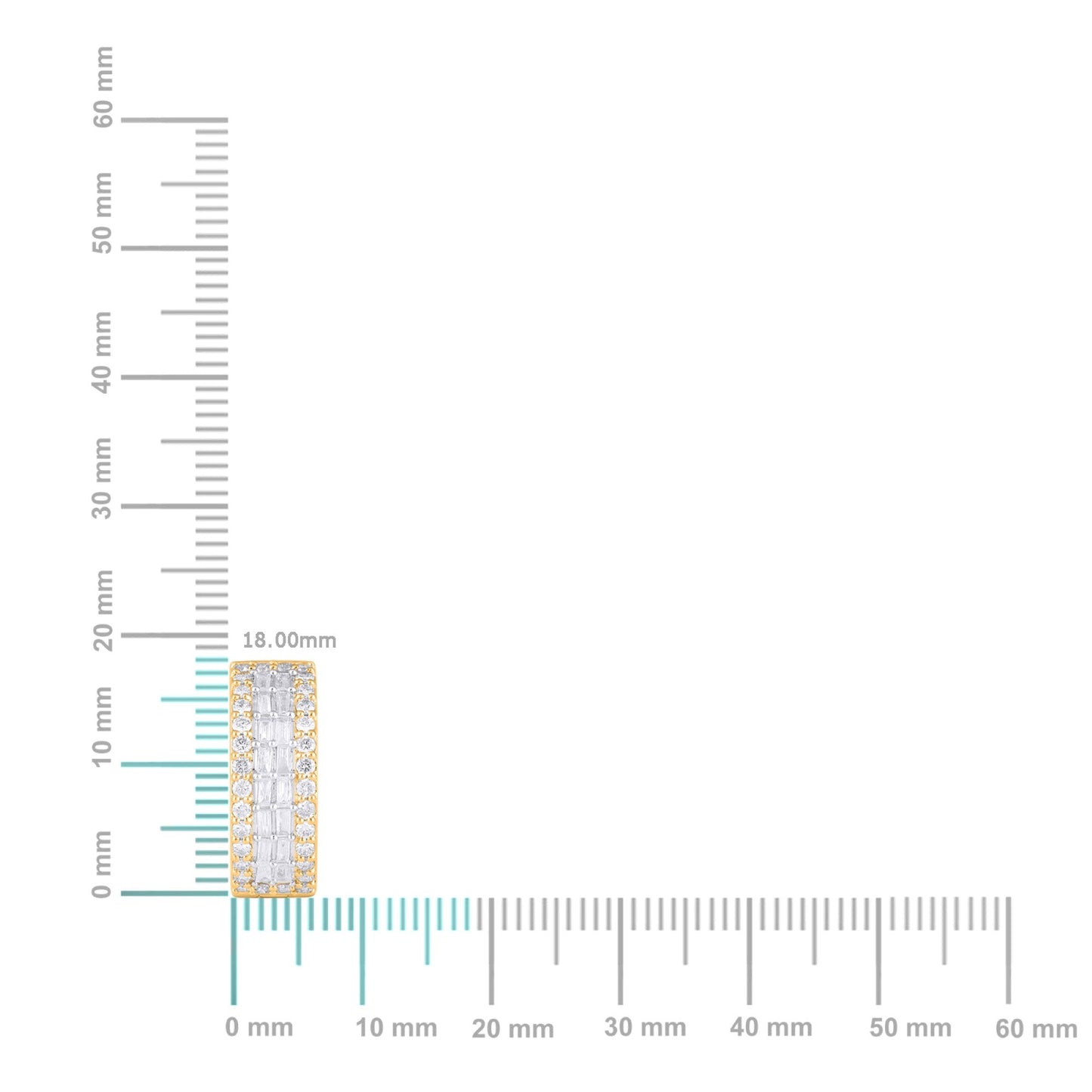 Make a bold statement with the 10K Yellow Gold Round Baguette Diamond 3 Row Designer Hoop Earrings. Crafted from rich 10K yellow gold, these exquisite hoops feature a captivating 3-row design adorned with 1 carat of radiant round and baguette-cut diamonds. The mix of diamond shapes adds texture and brilliance, creating a stunning contrast against the warm gold for a timeless, yet modern look.
