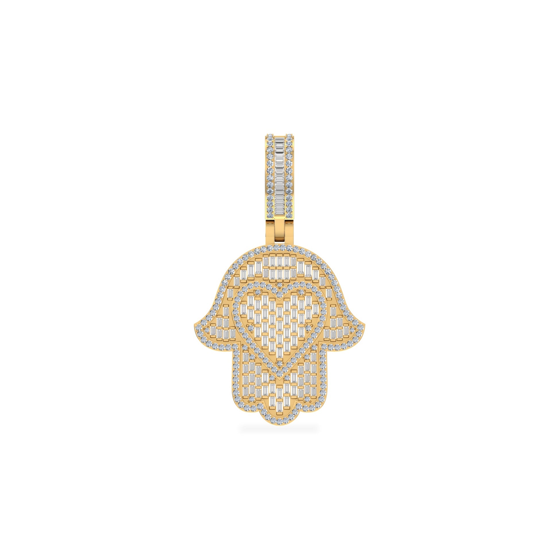 10K Yellow Gold Round Baguette Diamond Heart Hamza Hand Religious Charm Pendant 1-3/4 Ctw