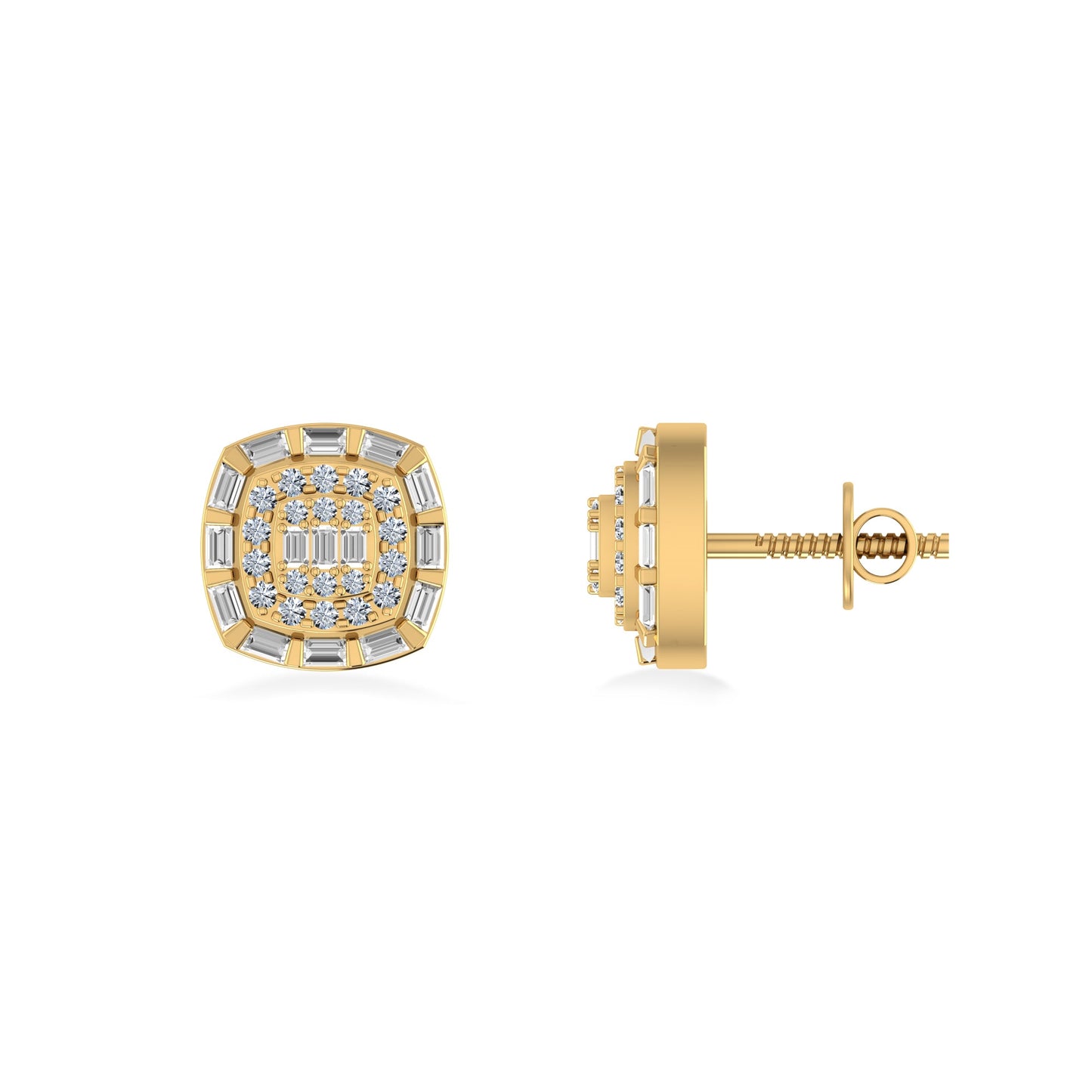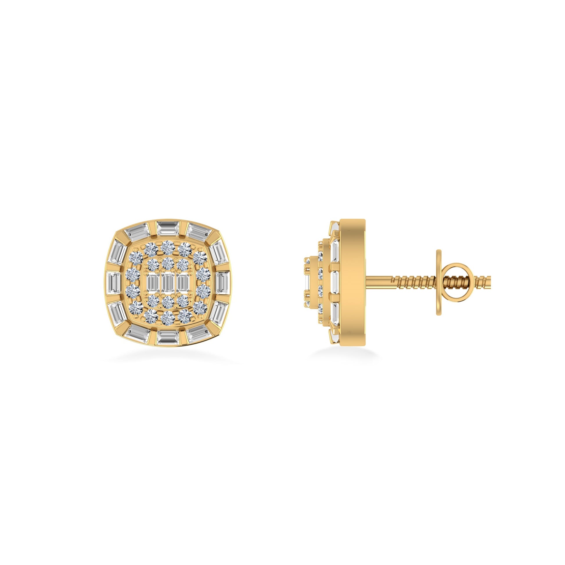 10K Yellow Gold Round Baguette Diamond Square Designer Earring 1/2 Ctw