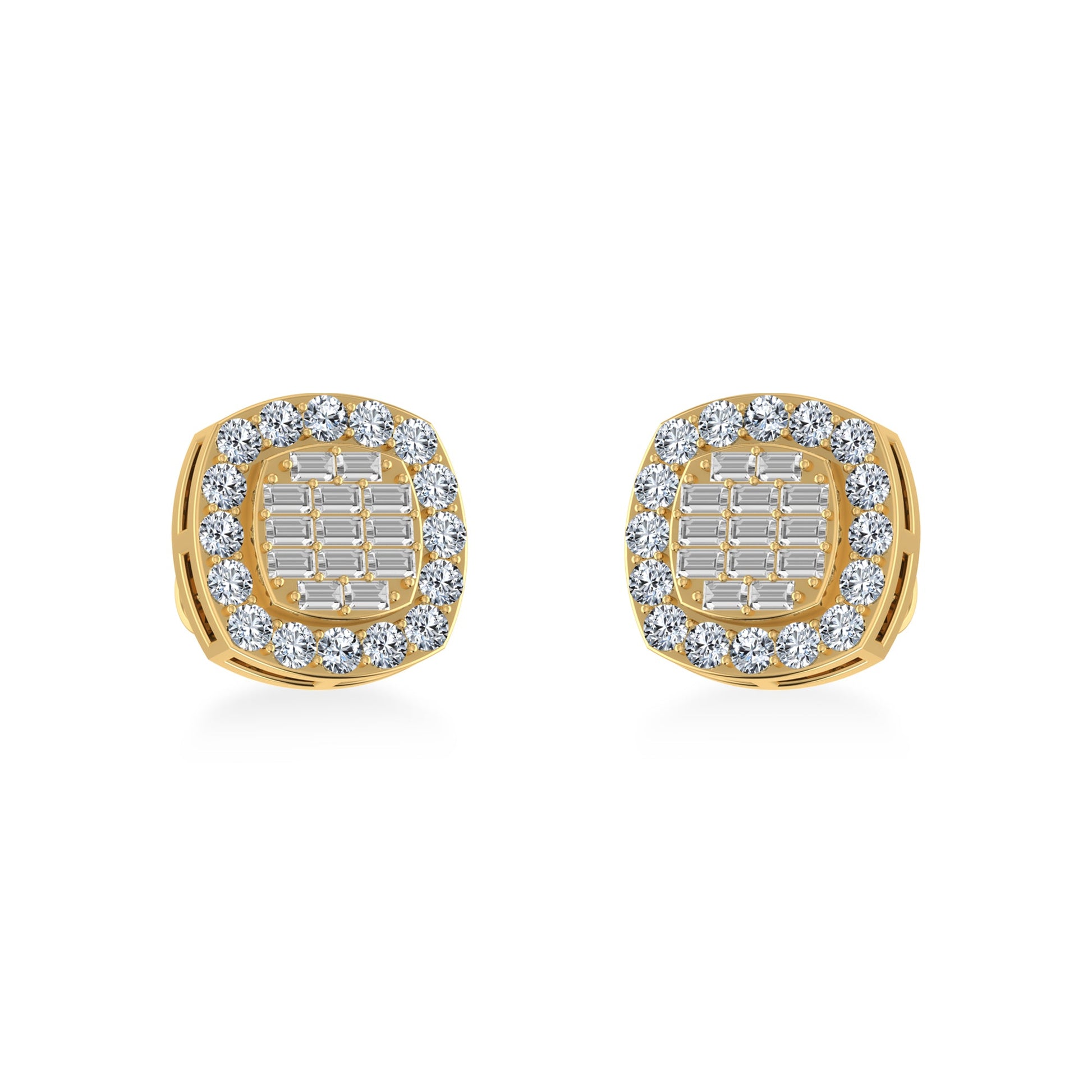 Each earring is artfully arranged to highlight the contrast between the sharp geometry of baguette cuts and the brilliance of round diamonds. Set in luminous yellow gold, the rich tones and intricate design make these studs a refined statement for any occasion.