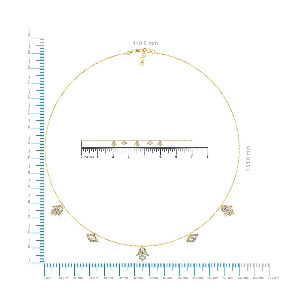 • Necklace: A graceful chain with a diamond-studded Hamsa hand and Evil Eye pendant