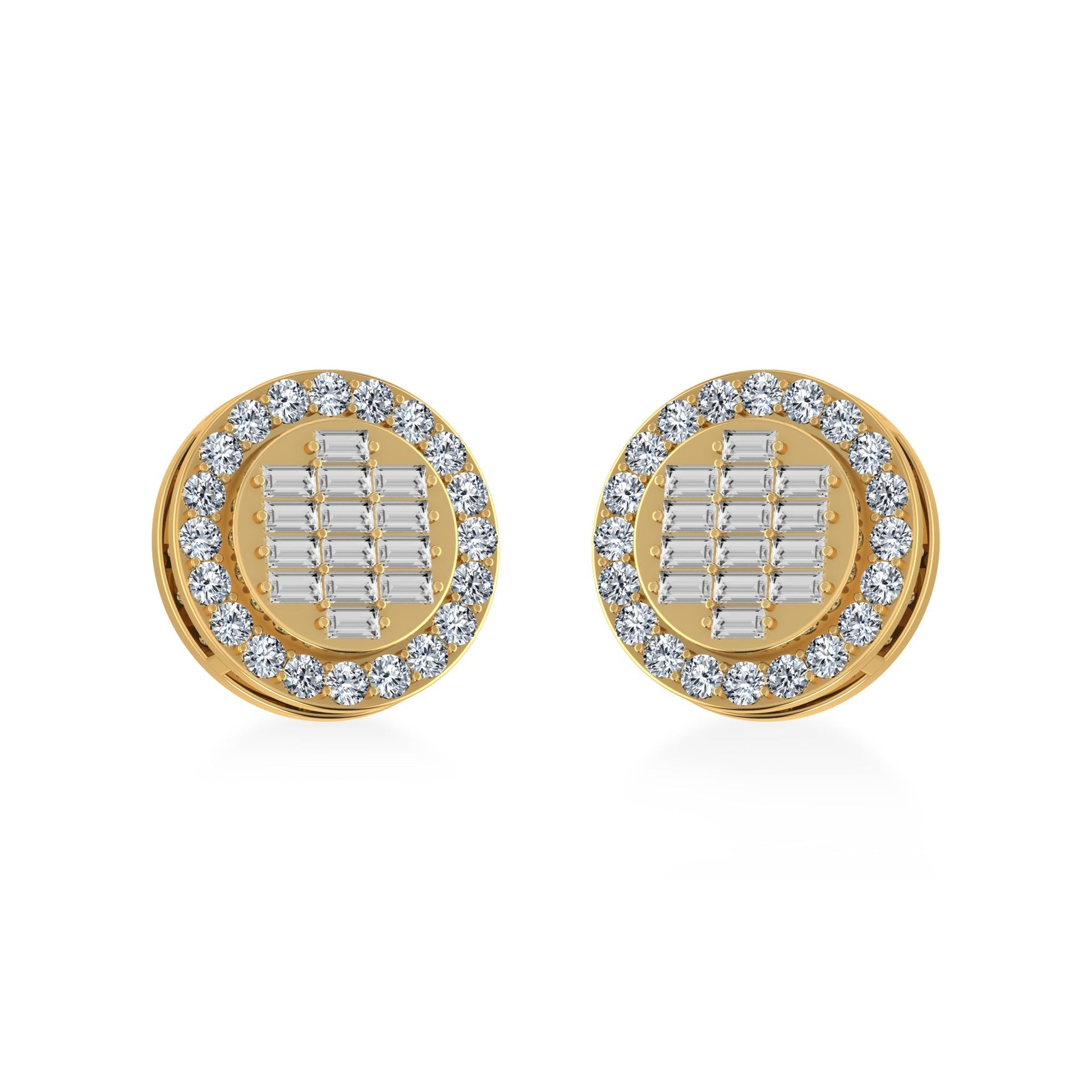 Elevate your style with these exquisite 14K yellow gold stud earrings. Featuring a stunning halo design, these earrings showcase a captivating blend of round and baguette diamonds, with a total weight of 5/8 carat. A true symbol of sophistication and elegance.