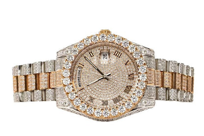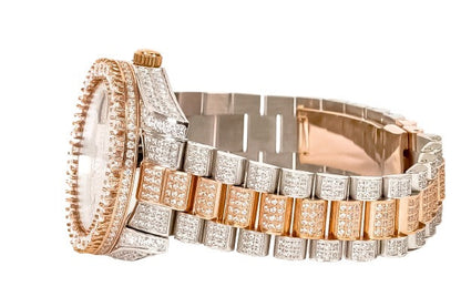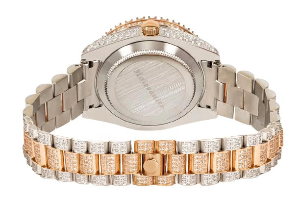 Introducing the Moissanite Stainless Steel Rose Two Tone Band Men’s Watch, a masterpiece of design, elegance, and luxury. With 17-1/3 Ctw of radiant Moissanite stones, this watch combines the timeless beauty of precious stones with the modern appeal of a rose two-tone stainless steel band. Crafted for the discerning man, this watch is as much a statement of style as it is a functional timepiece.