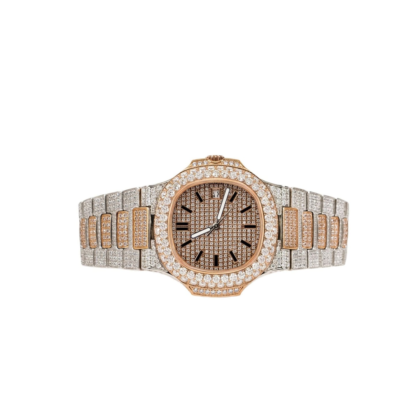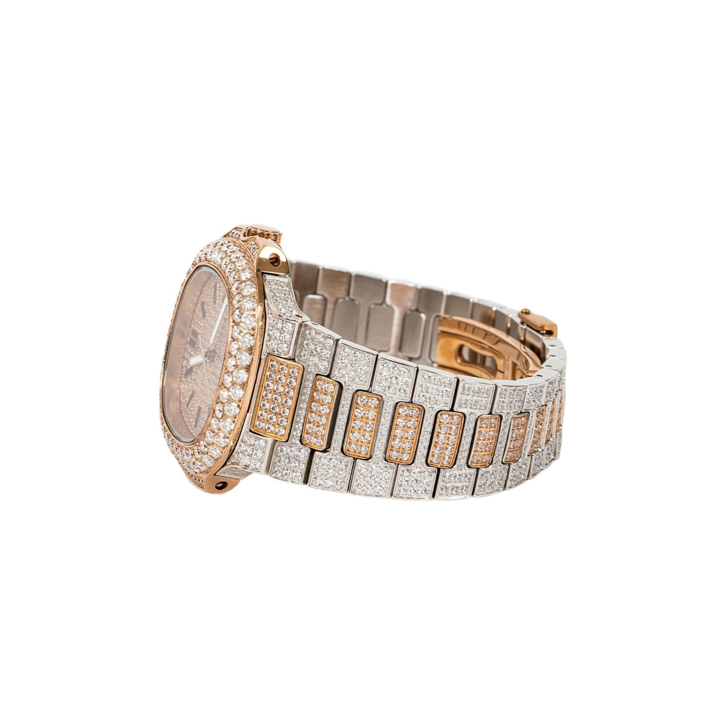 Discover the perfect balance of style and sophistication with the Moissanite Stainless Steel Rose Two Tone Band Men’s Watch. Designed for the man who values luxury and precision, this timepiece features a striking two-tone rose stainless steel band and is adorned with 18-1/3 Ctw of brilliant Moissanite stones, offering an elevated look for any occasion.