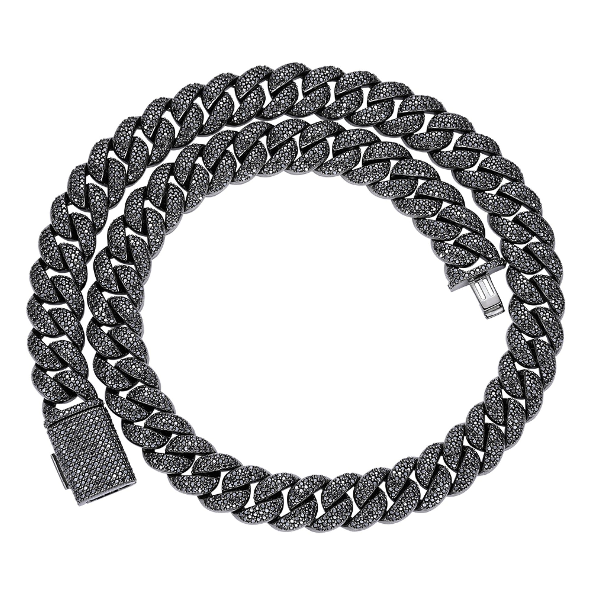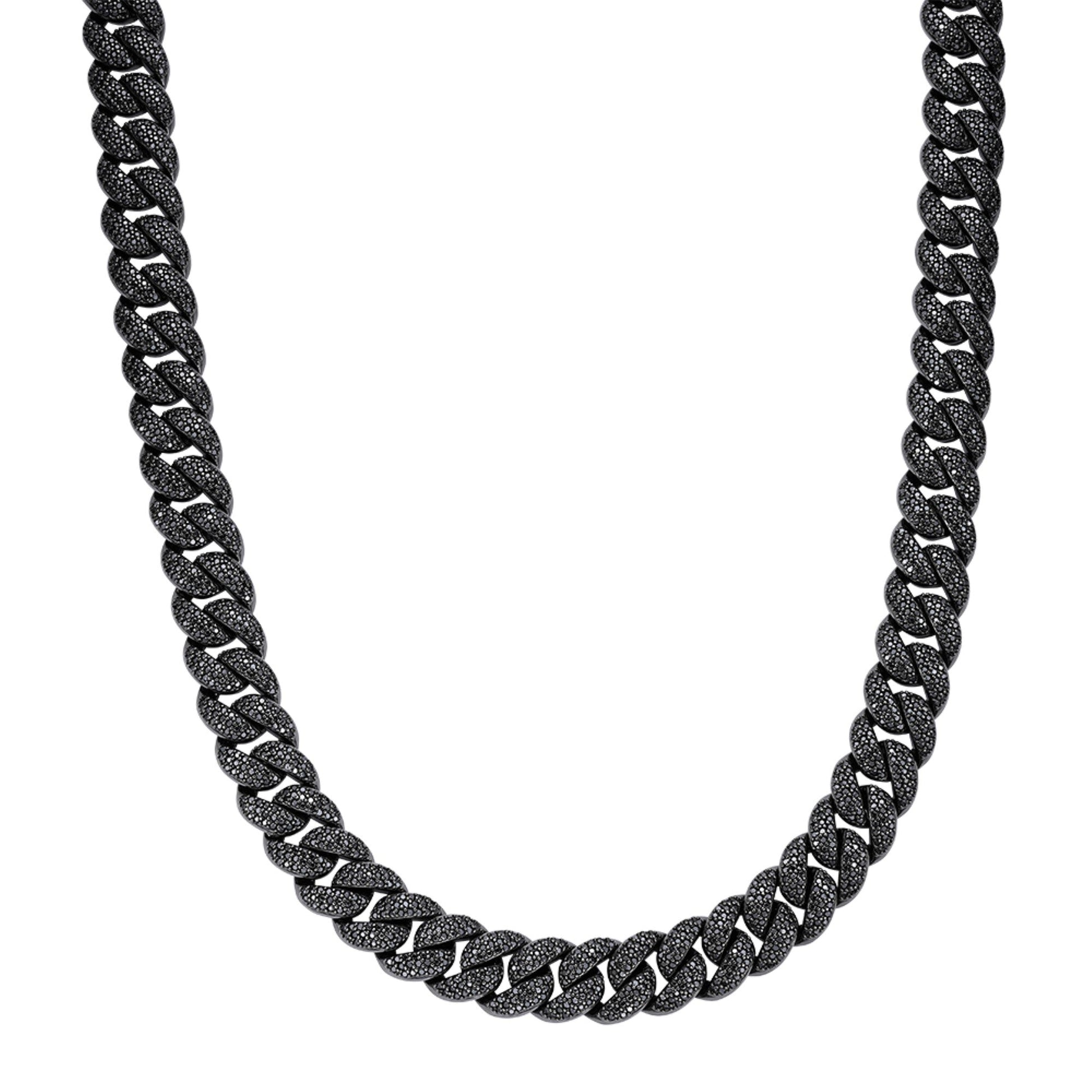 Command attention with this bold and luxurious Sterling Silver 15mm Black Moissanite Miami Cuban Chain Necklace. Featuring 27-1/3 carats of radiant round black Moissanite stones, this 22-inch designer piece brings together urban sophistication and unmatched shine. Perfect for the man who leads with confidence and isn’t afraid to stand out.