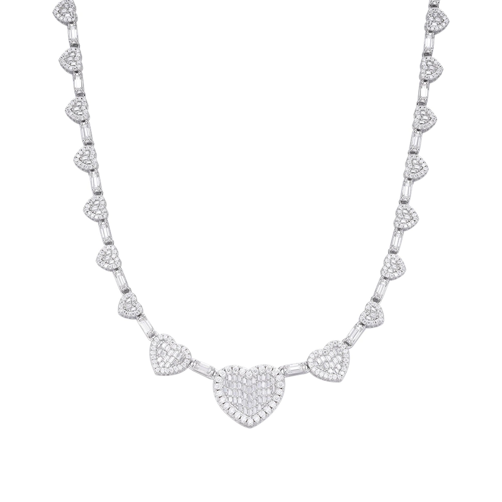 Sterling Silver Round Baguette Moissanite Heart Designer 18 Inch Necklace 14-5/8 Ctw
