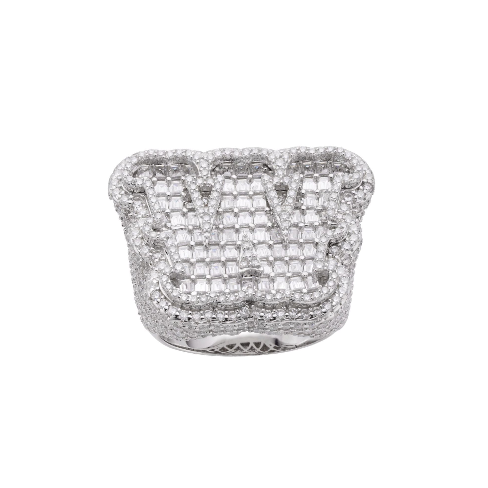 Make a bold statement with the Sterling Silver Round Baguette Moissanite Alphabet "W" Letter Initial Men’s Ring. Featuring 8-7/8 Ctw of brilliantly sparkling round and baguette Moissanite stones, this ring is designed to stand out with the sleek, sophisticated letter "W." Made from high-quality sterling silver, this piece is perfect for adding a personalized touch to your jewelry collection or giving a thoughtful, custom gift.