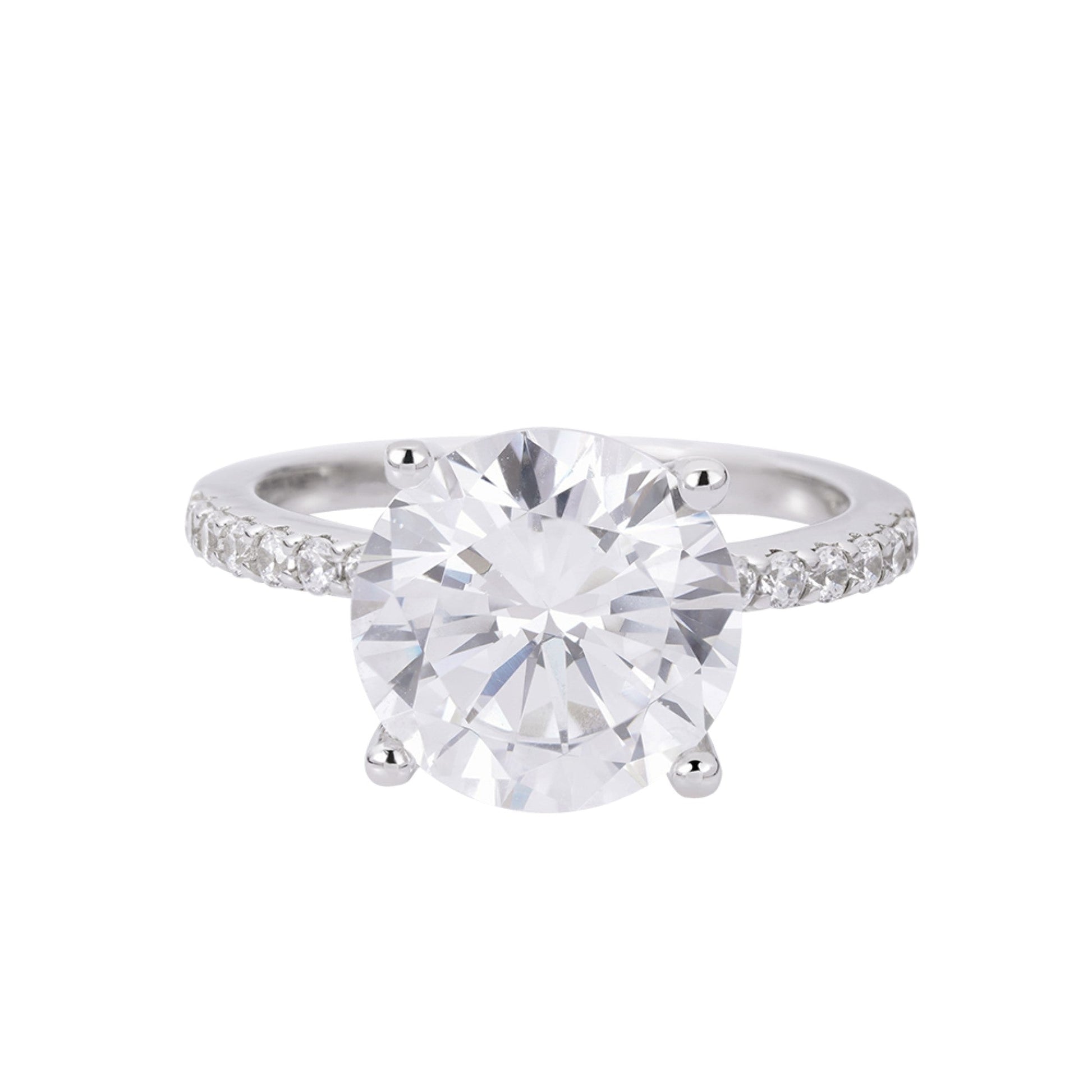 Stunning 4 Ctw round Moissanite stone at the center, with 0.26 Ctw of smaller stones surrounding it for added brilliance