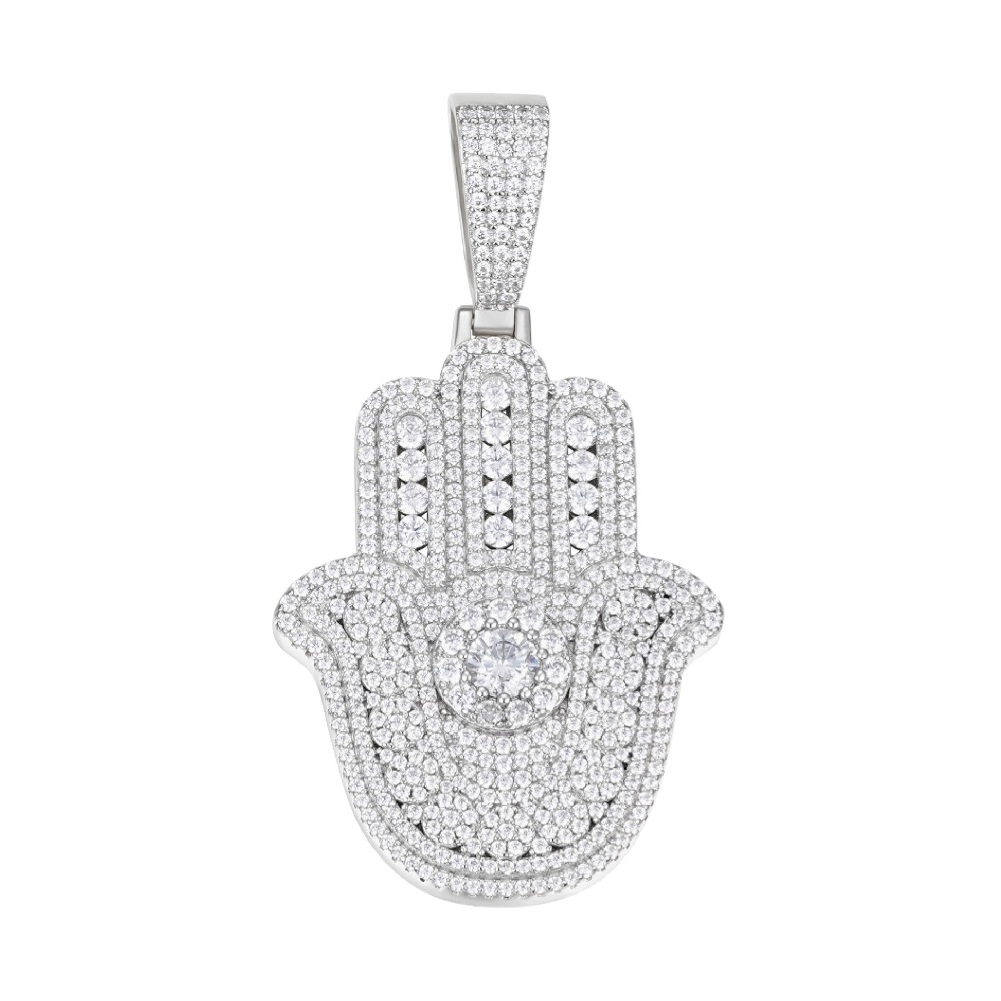 This stunning Sterling Silver Moissanite Hamza Hand Pendant is a powerful symbol of protection and positivity. Featuring 4-3/8 carats of round Moissanite stones, this pendant shines with remarkable brilliance. The Hamza hand, a universal symbol of defense, peace, and blessings, adds a meaningful touch to this exquisite piece. Crafted from high-quality sterling silver, this pendant is the perfect way to combine spiritual significance with luxurious style.