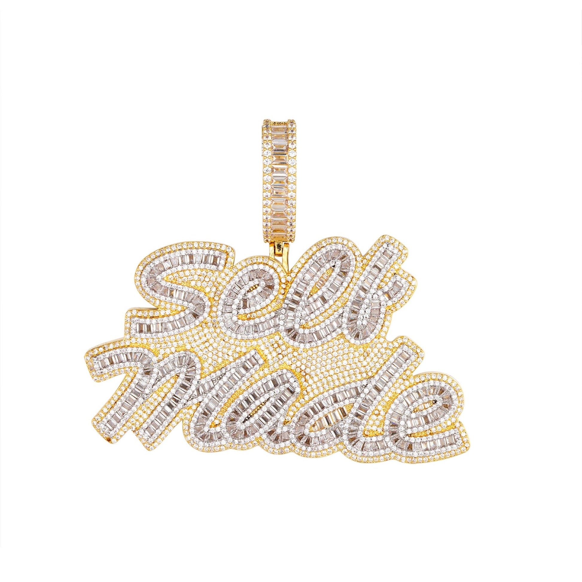 Embrace empowerment with this Sterling Silver Round Moissanite "Self Made" Word Pendant. Featuring 15-1/5 carats of round Moissanite stones, this pendant exudes confidence and brilliance. Crafted in premium sterling silver, the "Self Made" design makes a bold statement while radiating exceptional sparkle, making it a perfect piece for those who celebrate their personal achievements and success.